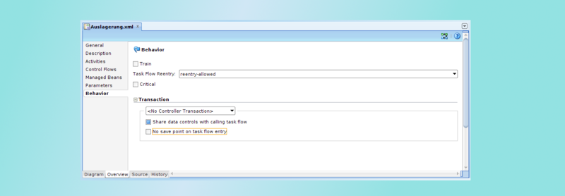 Durch die Kombination mit der Option Share Data Controls with Calling Task Flow werden die Transaktions-Grenzen aufgespannt. So kann festgelegt werden, ob die vorhandene Instanz eines Data Controls – und damit deren Status – wiederverwendet werden sollen.