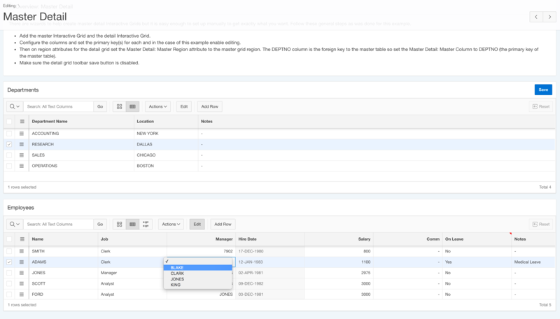 Im Gegensatz zu den alten tabellarischen Formularen können auch mehrere Interactive Grids auf eine Seite platziert werden. Einem Interactive Grid kann ein Parent Interactive Grid zugeordnet werden. Sobald man die korrespondierenden Spalten festgelegt hat, funktionieren die Interactive Grids als Master-Detail Formular. Referenziert man das gleiche Master Grid von einem zweiten Detail-Grid aus, so hat man ein Master-Detail-Detail Formular. Dient ein Detail-Grid als Master für ein weiteres, so liegt ein Parent-Child-Grandchild-Formular vor.