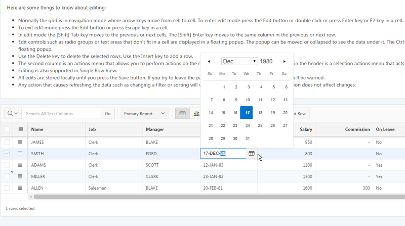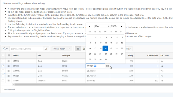 Zunächst stellt das Interactive Grid die Daten einfach nur dar – ganz wie ein Interactive Report. Wie beim interaktiven Bericht steht auch hier das Menü "Actions" bereit, mit dem Filter, Aggregate, Highlights und andere Berichtseigenschaften festgelegt werden können. Sobald jedoch "Editieren" aktiviert ist, kann das Interactive Grid seine Möglichkeiten voll ausschöpfen: Jede Spalte und jede Zeile kann nun geändert werden; wobei nicht nur alle APEX-Elementtypen, sondern auch Plug-Ins unterstützt werden. Änderungen werden zunächst lokal im Browser gehalten und bei Bedarf auf den Server gespeichert. Das Hinterlegen eigener PL/SQL-Codes ist ebenfalls möglich.