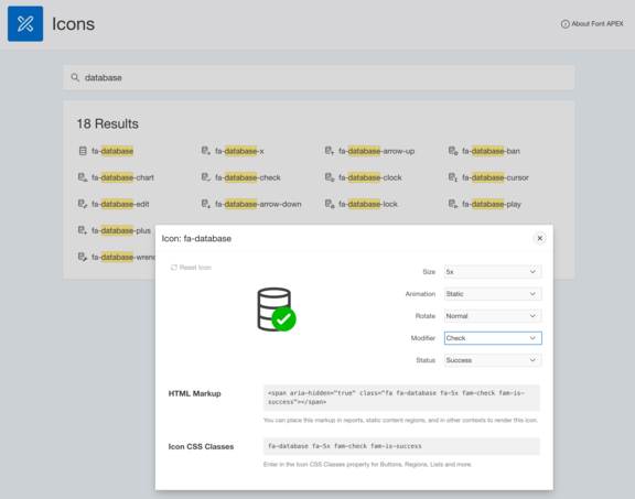 Mit APEX 5.0 wurde die populäre Icon Bibliothek Font Awesome integriert, mit der Icons per CSS-Klasse eingebunden werden können. Bilddateien sind nicht mehr nötig. Um den Icons einer APEX-Anwendung das gewisse Etwas zu verleihen, hat das Entwicklerteam für die Version 5.1 mit Font APEX eine eigene, zu Font Awesome kompatible Icon Bibliothek erstellt. Die neue Bibliothek enthält die Icons aus Font Awesome, verwendet aber ein eigenes Aussehen. Die Universal Theme Sample Application enthält eine Übersicht über die verfügbaren Icons.