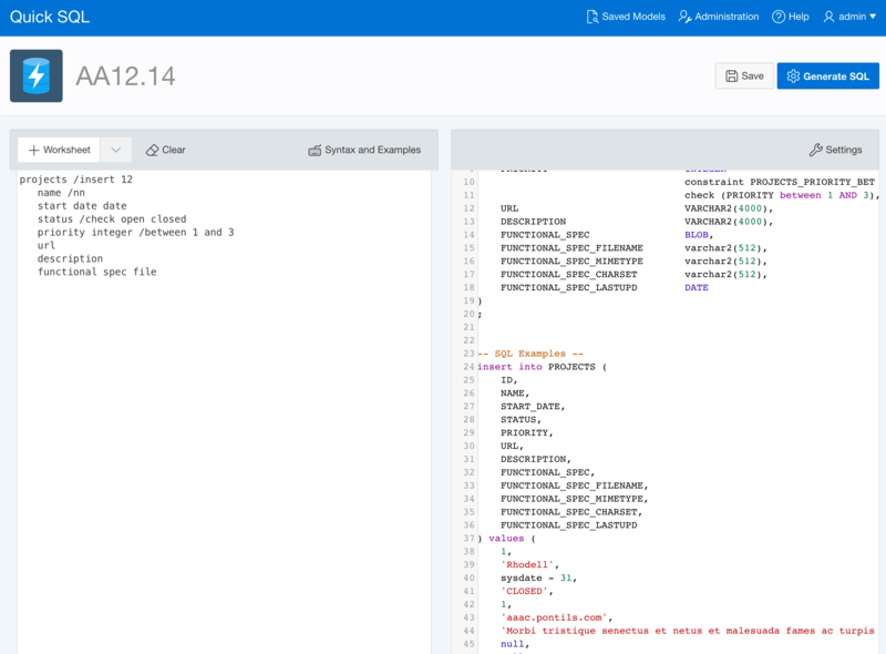 Quick SQL ist ein SQL Scratchpad, mit dem sich SQL Scripts erstellen lassen. Es stellt eine sehr kompakte Markdown-ähnliche Syntax zum Erstellen von Tabellen bereit. Boilerplate Code fällt damit weg. Aus den Eingaben generiert Quick SQL das syntaktisch korrekte SQL Skript, welches man in eine Oracle-Datenbank einspielen kann. Quick SQL kann INSERT-Kommandos generieren und erlaubt das schnelle Anlegen von Parent-Child Tabellen mit den entsprechenden Fremdschlüsseln. Neue Tabellen und einfache Datenmodelle lassen sich mit Quick SQL effizient generieren.