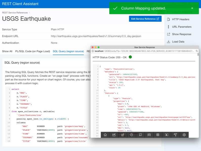 Zum Thema REST Services bringt APEX 5.1 gleich zwei Packaged Applications mit. Die REST Sample Application führt vor, wie man einen APEX-Bericht und ein Formular nicht auf eine lokale Tabelle, sondern auf einen entfernten REST Service einrichtet. Der Bericht ruft den REST Service auf und zeigt die Daten an. Das Formular ruft ebenfalls einen REST Service zum Speichern der Änderung auf. Der REST Client Assistant hilft beim Einbinden von REST Services in eigene Anwen-dungen. Diese Anwendung verbindet sich mit dem REST Service, zeigt die zurückgegebenen Daten tabellarisch an und generiert den SQL und PL/SQL Code, den man zur Nutzung des REST Service in der eigenen Anwendung benötigt.