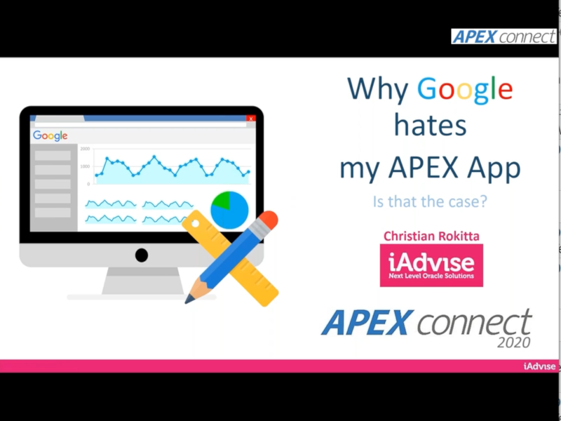 Christian Rokitta von iAdvise geht bei der APEX connect 2020 [Online] auf die Besonderheiten von APEX-Anwendungen im Zusammenspiel mit Google-Diensten ein.