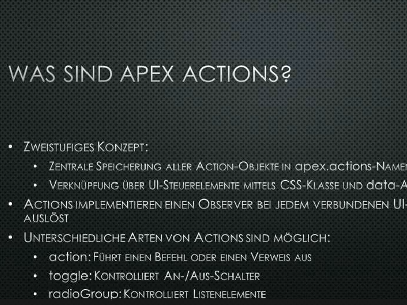 APEX-Actions (nicht zu verwechseln mit Dynamic Actions) existieren bereits seit Version 5.0 und stellen in grober Annäherung eine Implementierung des Command-Patterns in JavaScript dar. Ihr Zweck ist es, Befehle auf der APEX-Seite in einem JavaScript-Objekt zu kapseln, um zentral die Darstellung, Funktion und Tastaturkürzel verwalten zu können.