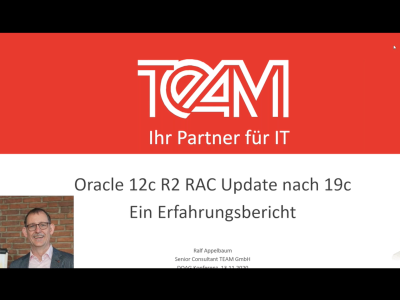 Beim DOAG Datenbank Online-Event liefert Ralf Appelbaum, Team GmbH, einen Erfahrungsbericht zum RAC-Update nach Oracle 19c.