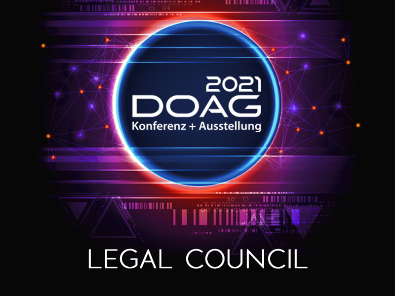 Am Dienstag, 16. November 2021, dem Eröffnungstag der DOAG 2021 Konferenz + Ausstellung Online, wird es ab 12 Uhr vier nacheinander besuchbare Vorträge des Legal Council geben. Sie haben Regulatorik, Datenschutz, Exitmanagement, Cloud, KI sowie Lizenzmanagement und SAP/Hana zum Inhalt.