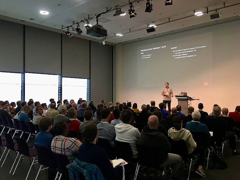 Der Thementag sollte sich hierbei als ein wahrer Renner erweisen, denn insgesamt neun Spezialthemen der DOAG-Communities, der IT und Oracle wurden jeweils in einem Raum von Anfang bis Ende ausgerollt: APEX & PL/SQL, Automation, Multitenant Architecture und Ransomware waren einige davon. Die Räume waren insgesamt gut bis sehr gut besucht und teilweise mussten sogar Stühle nachgereicht werden, da man nicht mit einem solchen Andrang gerechnet hatte – so geschehen bei der Session Keynote von Gerald Venzl "Was Leute noch immer in Oracle Datenbank machen, aber gar nicht mehr machen sollten".