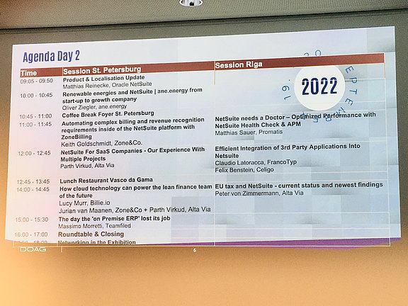 Der zweite Tag gab bereits ab 9 Uhr tiefe Einblicke in das aktuelle und zukünftige NetSuite Produktmanagement inklusive einer Q&A-Runde zur NetSuite Produktentwicklung. Die anschließenden 14 Fachvorträge zu unterschiedlichen Teilaspekten von NetSuite wurden von den DOAG-üblichen kulinarischen Breaks und einem Roundtable als offiziellem Abschluss abgerundet. Doch: Noch lange nach dem "official closing" war das Foyer St. Petersburg mit den Menschen und Gesichtern bevölkert, die in den vergangenen zwei Tagen die European Netsuite User Days mit einer sympathischen Energie zu einer Veranstaltung hatten werden lassen, die Vorfreude auf die Fortsetzung im kommenden Jahr weckte. Dazu sagte Peter von Zimmermann: