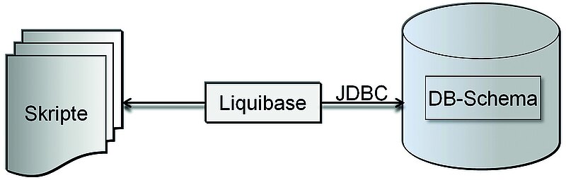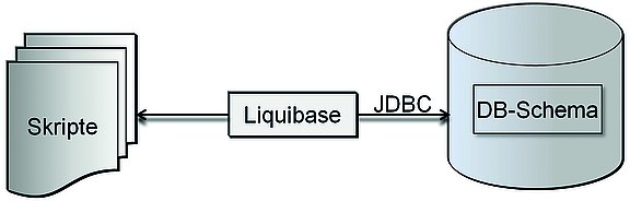 Liquibase baut über JDBC eine Verbindung zu einem bestimmten Datenbank-Schema auf und führt dort eine beliebige Anzahl von Liquibase-Skripten (sogenannte „ChangeLogs“) aus (siehe Abbildung 1). Diese rufen entweder weitere ChangeLogs auf oder enthalten eine oder mehrere logisch in sich abgeschlossene Datenbank-Änderungen (sogenannte „ChangeSets“). Diese wiederum enthalten zumeist Daten- oder Struktur-Änderungen, die entweder in einer Liquibase-spezifischen, datenbankunabhängigen Syntax (siehe unten) oder in datenbankspezifischem Code (wie PL/SQL-Blöcke) formuliert sind.