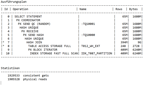 Natürlich konnte ich mit dieser Antwort nicht zufrieden sein. Also habe ich eine Tuningmaßnahme vorgenommen. Ich habe einen /*+parallel */ Hint eingefügt.