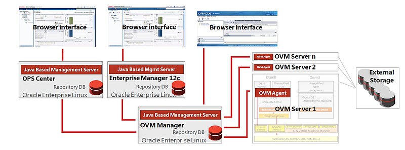 Oracle VM besteht aus zwei Komponenten: Der OVM Server fungiert als Host für die virtuellen Maschinen während der OVM Manager für die Verwaltung des OVM Servers und der virtuellen Server benötigt wird (siehe Grafik). Zusätzlich zum OVM Manager stehen als weitere grafische Oberflächen für die Verwaltung OEM12c oder Oracle Enterprise Manager Ops Center zur Verfügung. Alle drei Produkte haben einen unterschiedlichen Funktionsumfang und jede Komponente läuft in einer getrennten Weblogic-Instanz und benötigt ggf. ein Datenbank-Repository.