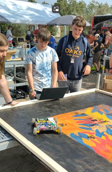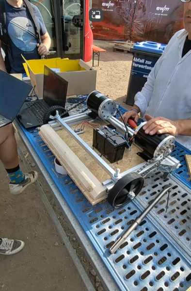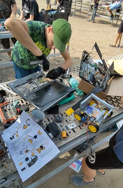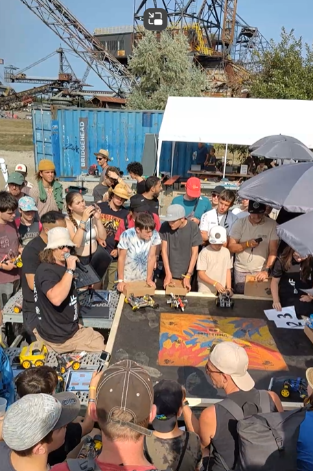 Die Interface AG hat den Bau kleiner Roboter, sogenannter Hebocons, begleitet, die eine Maximalgröße von 50 x 50 cm und ein Gewicht von 1 Kg nicht überschreiten durften. Als Bausatz wurde ein ESP32 Chip, vier Motoren, Räder und die Motorsteuerung nebst einer Anleitung ausgegeben. Dann konnten die Teilnehmerinnen und Teilnehmer loslegen und aus Schrott, den die Firma Bosch aus der Produktreihe „Bosch professional“ gesponsort hat, Roboter bauen. Das Ziel war, dass sich die Roboter in einem Ausscheidungswettkampf gegenseitig von einer 1 x 1 m großen Bühne stoßen konnten, die ebenfalls während des Festivals gebaut wurde.