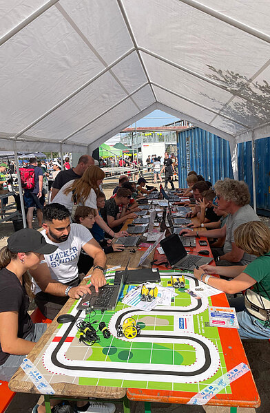 Der Bau solcher Roboter ist sehr Hardware-lastig, also musste auch die Programmierung gezeigt werden. Die Hackerschool hat also kurzerhand 16 Arbeitsplätze zur Verfügung gestellt, an denen den ganzen Tag kleine Workshops stattfanden, bei denen Software für die Robotersteuerung entwickelt werden konnte.