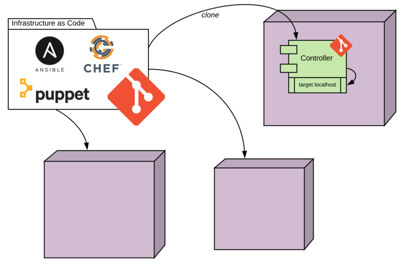 ⇒ Siehe dazu auch Abbildung 3 unten | Anwendungsbetrieb außerhalb Kubernetes mit GitOps durchzuführen ist momentan weniger verbreitet und benötigt etwas Kreativität, wie an dem vorigen Serverless-Function-Beispiel schon klar wurde. Was aber recht einfach zur erstklassigen GitOps-Implementierung wird, sind klassische Infrastructure-as-Code-Lösungen. Die kommen in der Cloud zwar tendenziell weniger häufig zum Einsatz, haben jedoch auch dort ihre Berechtigung. Übliche Umsetzungen erfüllen schon die meisten GitOps-Prinzipien. Die Deklarationen müssen eigentlich nur via Git verwaltet und verteilt werden. Puppet beispielsweise arbeitet schon nach dem Pull-Prinzip mit einem Agenten auf dem Zielsystem, bei Ansible könnte man die Durchführung nicht zentral, sondern dezentral durchführen, also einen Agenten darauf trimmen, sich ein Git-Repository zu klonen und das Playbook auf den eigenen Host anzuwenden. Wenn man seine Systeme inklusive Fachanwendungen also über eins dieser Systeme beschreiben und konfigurieren kann und noch einen regelmäßigen Abgleich durchführt, lässt sich GitOps auch wunderbar ohne Kubernetes spielen.