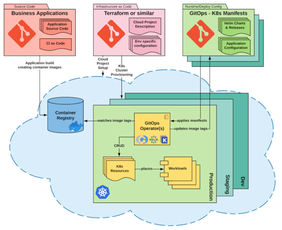 ⇒ Siehe dazu auch Abbildung 2 unten | Werfen wir einen Blick auf ein typisches Kubernetes-Setup mit GitOps in einer Public Cloud. Auf der linken Seite haben wir unsere Geschäftsanwendungen. Deren Quell-Code wird sowieso in Git verwaltet, Änderungen erfolgen nur nach Review und Freigabe durch ein Teammitglied. Die Anwendungen werden nach bester Manier gebaut und getestet, die dafür nötige Continuous-Integration wird natürlich zusammen mit dem Quell-Code versioniert. Mit etwas gutem Willen bekommt man sein Build-System schon ziemlich gut deklarativ hin, meist ist jedoch noch eine Portion Prozessuales dabei, das ist hier allerdings nicht weiter schlimm, da ein Build-Ergebnis nichts ist, was an einen Zustand angeglichen werden muss – gebaut oder nicht gebaut, das ist die einzige Frage. Das entstandene Artefakt, meist ein Container Image, wird in eine Container Registry geladen, damit ist die Anwendungsseite abgeschlossen. In den meisten GitOps-Modellen möchte man eine klare Trennung zwischen Continuous-Integration und Continuous-Delivery, da hiermit das "Pull-Prinzip" erzwungen wird. Mittig definieren wir die gesamte Basis-Infrastruktur. Alles als Code und auch deklarativ.