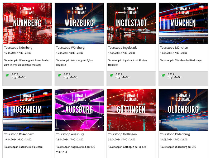 Derweil kannst du alle verfügbaren Tour-Termine auch auf der Seite h2c.doag.org finden. Wichtig zu wissen ist: Die Tour-Tickets der Stationen sind zwar kostenfrei, müssen allerdings über ein Ticketsystem gebucht werden, da sie limitiert sind. Möchtest du unter den 40 Teilnehmenden eines Tourstopps sein, dann buche dir noch heute im H2C-Tourshop dein Ticket und freue dich auf die Highway to CloudLand Roadshow in deiner Stadt.