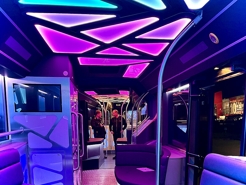 Der Clou: Dieser Bus ist kein gewöhnlicher Gelenkbus, der mit seinen 18 Längenmetern, seiner feuerroten Folierung und dem DOAG-Maskottchen an sich schon ein Eyecatcher ist. Der DOAG-Tourbus ist – man kann es kaum anders ausdrücken – ein richtiger Partybus. Er ermöglicht mit seiner speziellen Innenausstattung, der Beleuchtung und dem Soundsystem ein richtiges Happening, das von frischgebackener Pizza (im Bus zubereitet) und kühlem Bier (im Bus bereitgestellt) gekrönt wird.