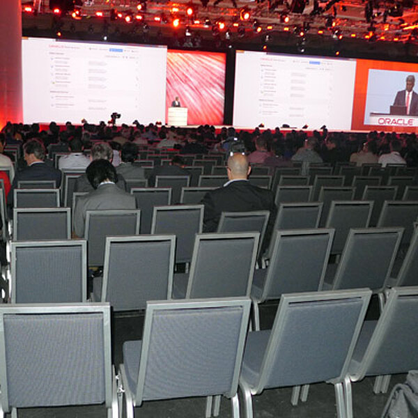 Die Halle ist bis auf den letzten Platz gefüllt. Rund 20.000 Teilnehmer warten auf die zweite Keynote des Oracle-Chefs. Dann kommt die Ansage: „Larry Ellison ist wegen des America´s Cup leider verhindert“.
