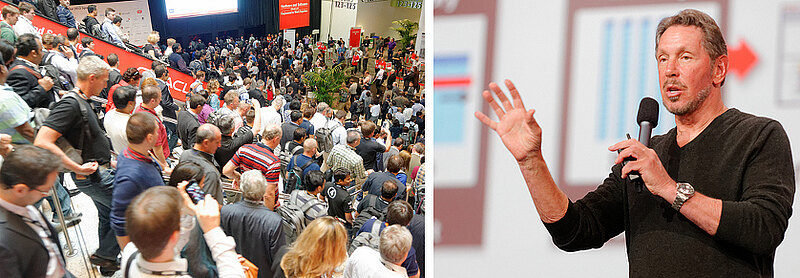 In bester Laune betritt Larry Ellison die Bühne, was wohl in erster Linie daran liegt, dass sein Team Oracle USA einige Stunden zuvor bei schönstem Wetter gleich zwei Segelwettfahrten des 34. America´s Cup gewonnen hat. So fällt auch die Überleitung zur ersten Ankündigung leicht, denn auch hier geht es darum, dass Oracle die schnellste Datenbank der Welt vorzeigen möchte.
