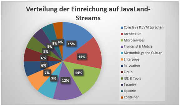 Die Verteilung der über 500 eingereichten Vorträge auf die zwölf Streams ist wie im Vorjahr relativ gleichmäßig. Eine erste Analyse verspricht wieder einmal ein abwechslungsreiches Programm.