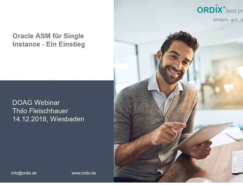 In der Webinar-Aufzeichnung vom 14. Dezember bietet Thilo Fleischhauer (ORDIX) einen Einstieg in das Thema Oracle Automatic Storage Management (ASM) für Single Instance und trägt damit der wachsenden Bedeutung von ASM bei Kunden Rechnung. Immer häufiger wird das Automatic Storage Management hier eingesetzt – vorwiegend bei den Engineered Systemen Exadata und Oracle Database Appliance sowie in Real Application Clusters (Standard Edition SE oder SE2). Damit Oracle ASM mit Oracle Restart für Single-Instance-Umgebungen verfügbar ist, muss die Grid Infrastructure installiert sein. Auf diese sowie weitere Voraussetzungen für Oracle ASM geht Fleischhauer in der Aufzeichnung vertiefend ein.