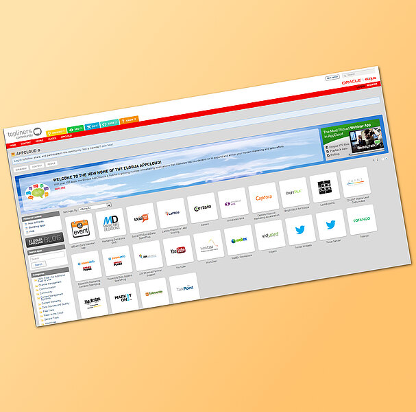 Für die Eloqua AppCloud hat Oracle über 20 neue Partner gewonnen, die die Plattform mit über 100 Anwendungen versorgen. Mit dieser zusätzlichen Palette von Marketing-Anwendungen können Unternehmen ihre Marketing- Aktivitäten nach Bedarf erweitern und bereichern.