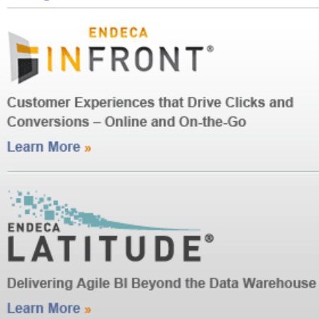 Endeca Infront, eine der führenden CEM-Plattform (Customer Experience Management), soll Oracle ATG Commerce ergänzen und Cross-Channel-Commerce, Merchandising und Online-Kundenzufriedenheit für den Internet-Handel verbessern. Endeca Latitude, welche die schnelle Entwicklung analytischer Anwendungen möglich macht, soll Oracle Business Intelligence Entreprise Edition (OBI EE) aufstocken und somit eine einheitliche Analysesoftware für strukturierte und unstrukturierte Daten zur Verfügung stellen.