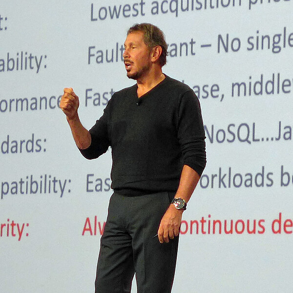 Oracle ist relativ spät auf den Cloud-Zug aufgesprungen. Bei Ellisons Rede entsteht jedoch der Eindruck, dass Oracle alles daran setzt, um führender Cloud-Anbieter zu werden. Entsprechend holt man gegenüber der Konkurrenz auf. Larry Ellison verkneift sich dabei auch keinen Seitenhieb gegenüber SAP und IBM, die ja bekanntlich beide noch keine eigene Cloud anbieten. Er sieht sich heute im Wettbewerb mit Workday und Salesforce. Für das kommende Jahr hat Oracle im Cloud-Geschäft einen Umsatz von 1,5 Milliarden Dollar eingeplant.