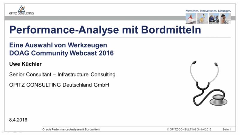 Nicht immer stehen einem Datenbankadministrator GUI-basierte (und oftmals teure) Tools zur Verfügung, um ein Performance-Problem in der Datenbank zu analysieren. Mit den vorhandenen "Bordmitteln" der Datenbank kann man jedoch auch eine gute Diagnose stellen. In dieser Webinar-Aufzeichnung vom 8. April 2016 widmet sich Uwe Küchler einer Auswahl dieser Werkzeuge und legt einen Schwerpunkt auf die Möglichkeiten, die einem in der Standard Edition und ohne Tuning Pack zur Verfügung stehen – insbesondere Statspack in Kombination mit SQL Developer.