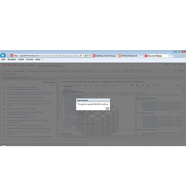 Es ist ein lästiger Automatismus: Hat ein User ein Suchergebnis oder eine Support-Note im Browser offen, so hat er etwa eine Stunde Zeit, um sich damit zu befassen. Wenn er die Seite im Browser zu einem späteren Zeitpunkt annavigiert, erscheint die Meldung „The page has expired. Click OK to continue.“ Der User wird dann weitergeleitet und landet auf der Einstiegsseite. Dieses Verhalten konnte die DOAG sowohl unter Internet-Explorer als auch unter Firefox feststellen.