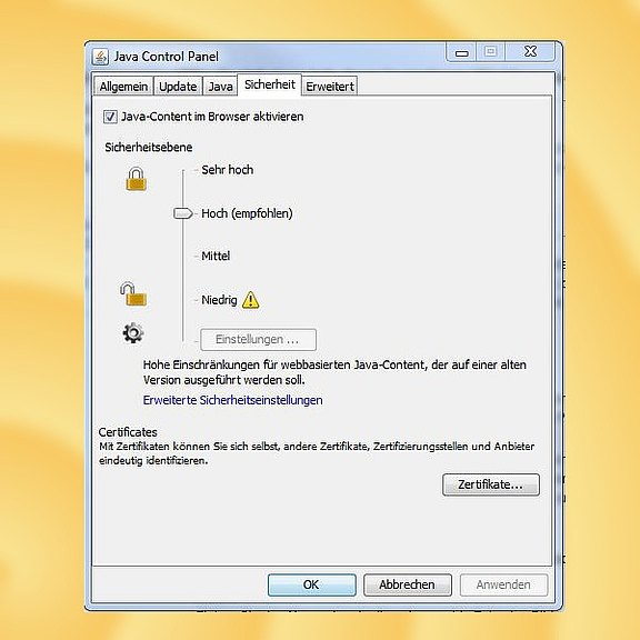 Um sich vor solchen Schwachstellen im Webbrowser zu schützen, sollten die Sicherheitseinstellungen im Java Control Panel auf "hoch" gestellt werden. So wird der Benutzer explizit gefragt, ob unsignierte Java-Applets oder -Webapplikationen ausgeführt werden sollen.
