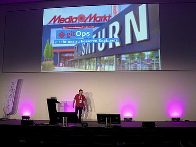 Auf der Main Stage des ersten deutschsprachigen Cloud Native Festivals war der Experte aus Ingolstadt ganz in seinem Element: GitOps.