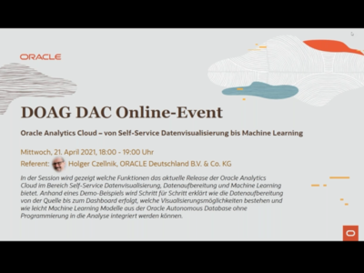 Beim DOAG DAC Online-Event am 21. April zeigte Holger Czellnik von Oracle, welche Funktionen das aktuelle Release der Oracle Analytics Cloud bietet.
