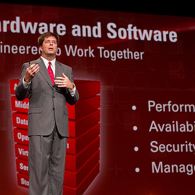 Als Larry Ellison die Bühne betritt, ist ihm seine gute Laune anzumerken. Er schaut sich die überfüllte Halle D vom Kongresszentrum Moscone Nord an…